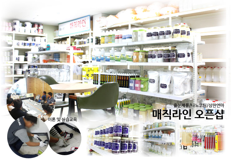 주식회사 매직라인 오픈샵에는 반짝이 안료, 세라믹안료, 유리안료 등 다양한 펄 제품들과 줄눈 충진용 전용 제품인 바닥줄눈제, 벽용줄눈제, 실리콘전용 줄눈제 및 프라이머, 줄눈제거용 수공구 및 기계공구 등 줄눈에 관련된 제품들을 만나볼 수 있으며, 매직라인 본사 매장 방문 시 더욱 저렴한 가격에 구입할 수 있다.