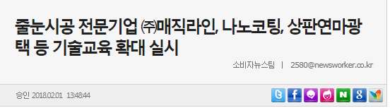 [뉴스워커: 소비자뉴스팀] 국내 최고의 줄눈시공 기술력으로 주목을 받고 있는 ㈜매직라인이 “2018년부터 나노코팅, 상판연마광택, 무기질코팅, 스페셜코트에 대한 기술교육을 더욱 확대할 예정이다”라고 밝혔다.