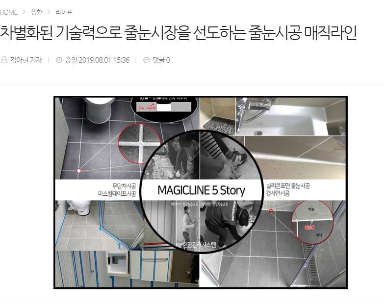 매직라인이 자랑하는 ‘5 Story’는 오차 없는 줄눈시공을 위한 마스킹 테이프시공, 독보적인 줄눈기술력의 무단차 시공,
