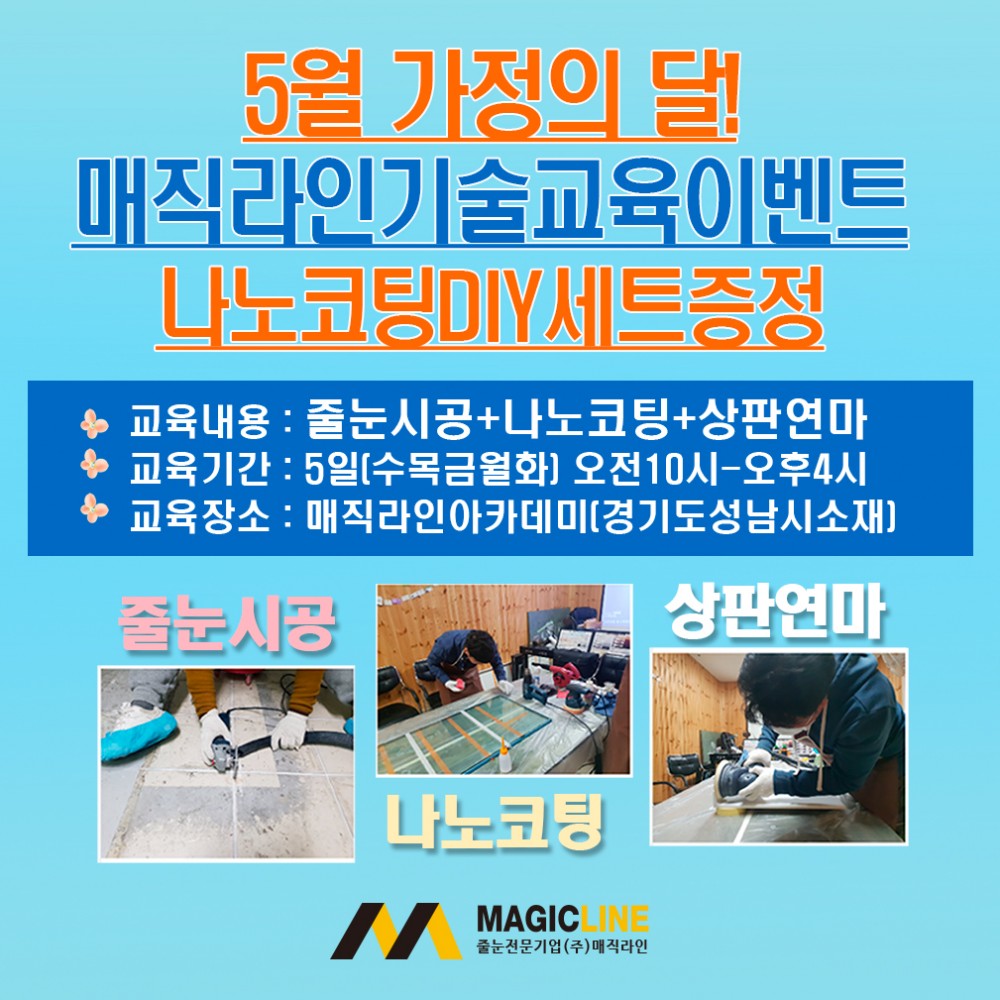 [스마트경제] 줄눈 시공 전문 기업 ㈜매직라인이 5월 가정의 달을 맞아 기술교육 이벤트를 진행한다고 전했다.